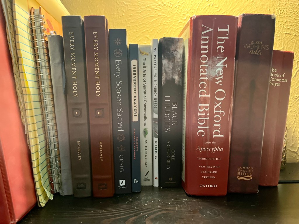 As a priest, my bookshelves are lined with prayer books. There are the obvious ones like The Book of Common Prayer, Book of Occasional Services, and A New Zealand Prayer Book, and the ones gifted to me at the beginning of my ordained ministry—Women’s Uncommon Prayers and a tiny red book of school chapel prayers. The prayer books I use most frequently line the left side of my desk, easily accessed while writing letters, sermons, Grow Christians posts, and liturgies. For what it’s worth, these books include Every Season Sacred, 99 Prayers Your Church Needs But Doesn’t Know It Yet, Black Liturgies, Every Moment Holy Volumes I & II.